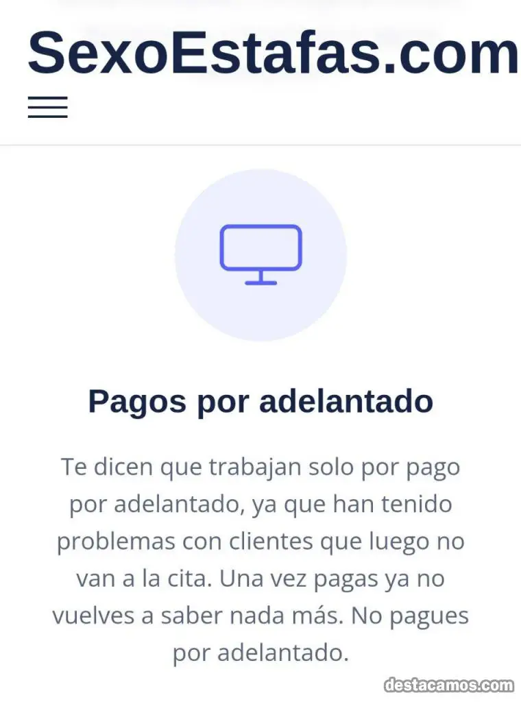 - Cobros por adelantado / anticipo (No pagues por adelantado ningún taxi o parte de un , te bloquearán en la gran mayoría, no pagues por adelantado a ninguna chica que no conozcas)