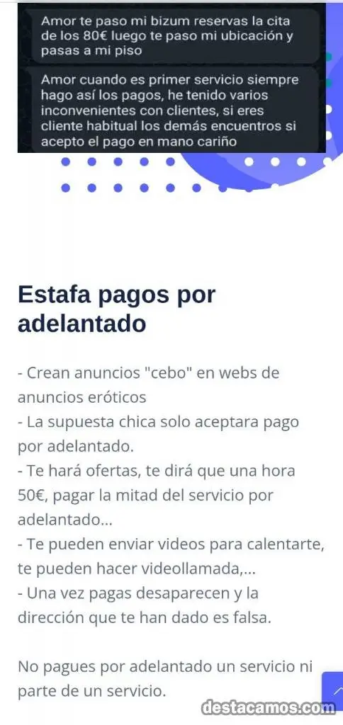 - Cobros por adelantado / anticipo (No pagues por adelantado ningún taxi o parte de un , te bloquearán en la gran mayoría, no pagues por adelantado a ninguna chica que no conozcas)